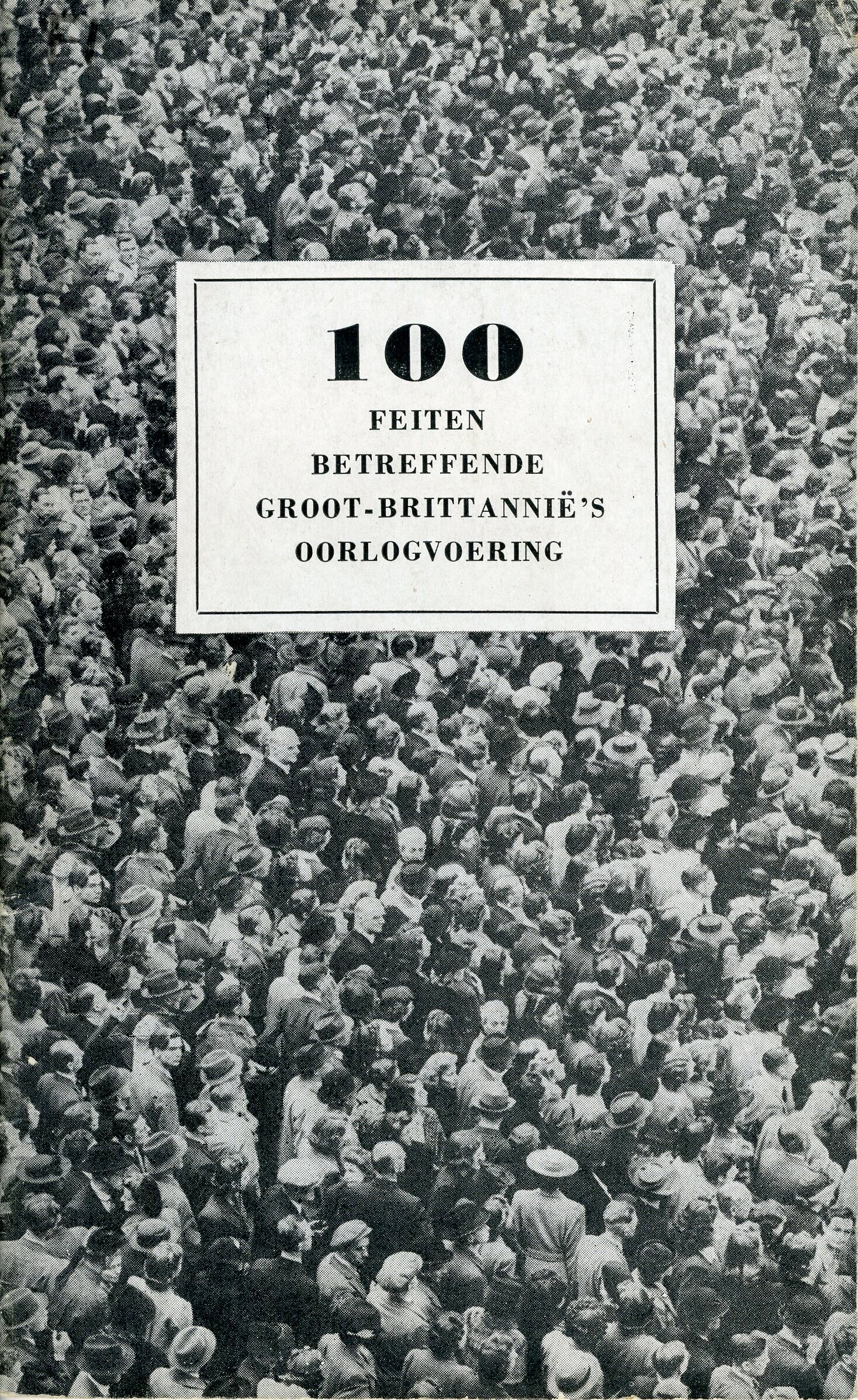 Een boekje met de titel: "100 feiten betreffende Groot-Brittanië's oorlogvoering", "Uitgegeven door het Britsche ministerie van Voorlichting en gedrukt door de Landsdrukkerij te Londen. januari 1945". In het boekje wordt een beeld gegeven van de wijze waarop het Britse volk aan de oorlog heeft deelgenomen en de prijs die daarvoor werd betaald. Het boekje bestaat uit 47 pagina en is geïllustreerd met zwart-wit foto's en statistische gegevens.