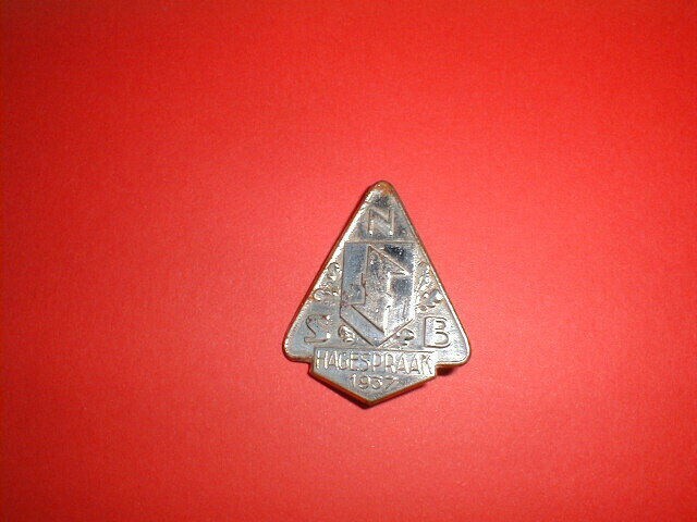 Driehoekig zilverkleurig metalen speldje met tussen "N.S.B." de afbeelding van de wolfsangel en geheel onder: "Hagespraak 1937". Uitgegeven ter gelegenheid van de 2e Hagespraak georganiseerd door de N.S.B. op 17 mei 1937 op de Goudsberg te Lunteren.