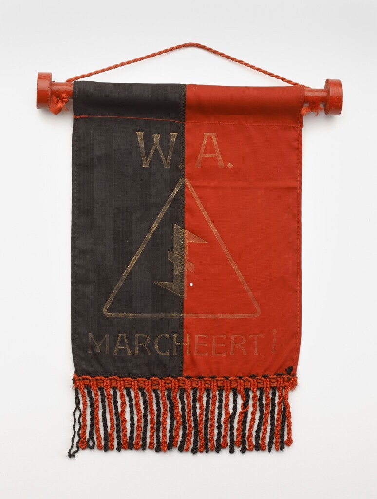 Een rood met zwart vaantje bedrukt met de gouden wolfsangel binnen een driehoekig kader: het symbool van de Weerbaarheidsafdeling van de N.S.B. Verder de tekst: "W.A. marcheert!". Het vaantje heeft aan de onderkant rood en zwart franje en is aan de bovenkant bevestigd aan een rood geverfd houten stokje met rood touwtje om het vaantje aan op te hangen.