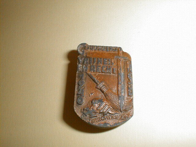 Een metalen NSB-speldje met bovenaan in reliëf: "Goudsberg", hieronder: "Vrijheid en recht 1940". Geheel rechts een ontbloot zwaard met langs de zijkant: "NSB". Midden onder een bezem die de symbolen van de tegenmachten wegveegt: Frygische muts en kruis. Daaronder: "Ongerechtigheid". Herinneringsspeld van de in de openluchtbijeenkomst van de NSB: 5e Hagespraak “Vrijheid en Recht” op de Goudsberg te Lunteren op 22 juni 1940.