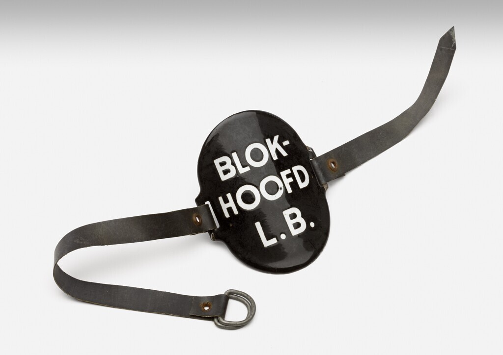 Twee ovale zwart geëmailleerde zwart metalen plaatjes voorzien van twee leren riempjes om het plaatje vast te maken om de arm. Op een van de plaatjes in witte letters: "Blokploeg L.B." en de ander "Blokhoofd L.B."
