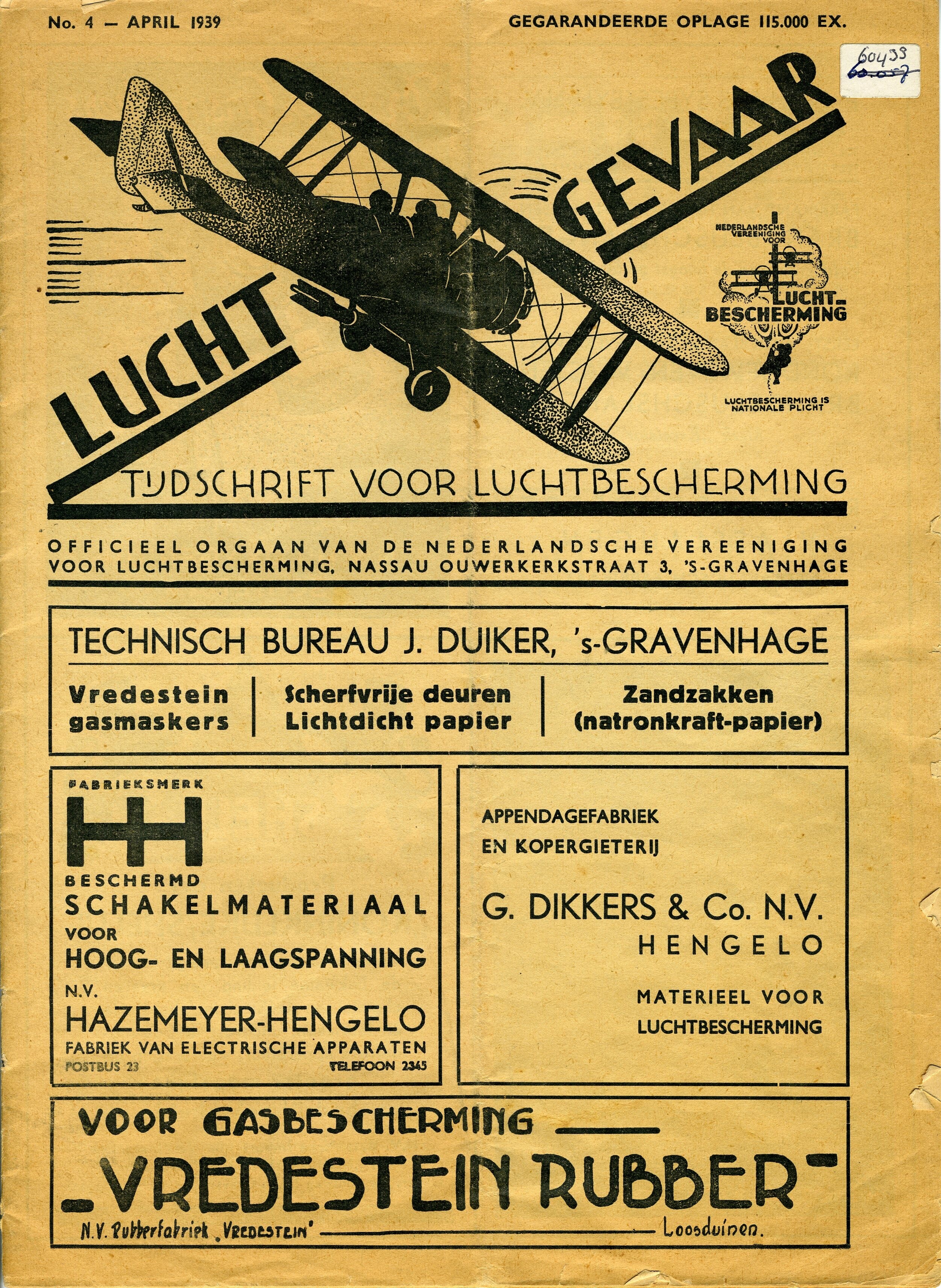 Orgaan van de Nederlandsche Vereeniging voor Luchtbescherming. Op de voorzijde bovenaan een afbeelding van een dubbeldekker tussen de naam van het blad. De rest van de voorpagina en de achterzijde bevatten advertenties.