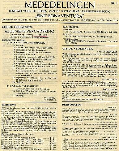 Twee gedrukte mededelingen (nummer 1 en 2) en een voorafgaande brief bestemd voor de leden van de Katholieke lerarenvereniging "Sint Bonaventura". De voorafgaande brief, gedateerd 15 december 1941 waarin het opheffen en samengaan van tijdschriften wordt aangekondigd.