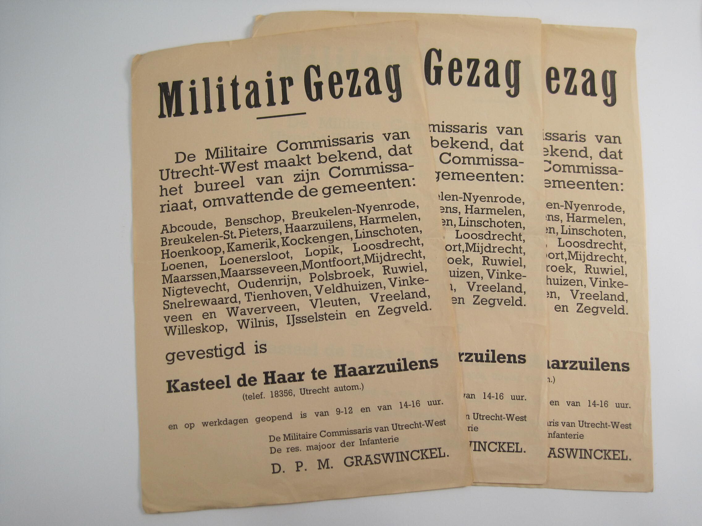Aankondiging van het Militair Gezag betreffende de vestiging van het Commissariaat in kasteel Haarzuilens gedrukt op gelig papier.