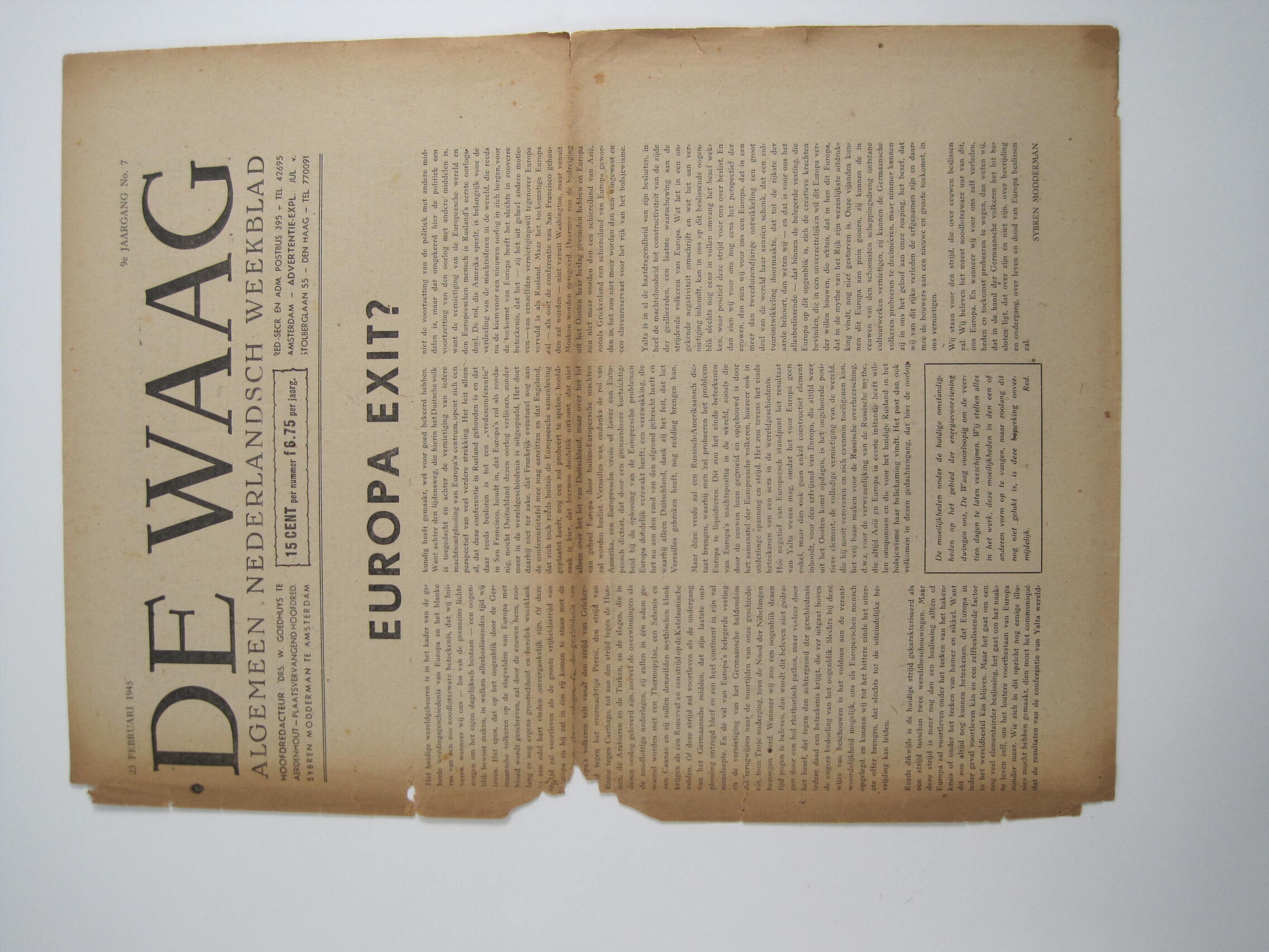 Een uitgave van het pro-Duitse weekblad "De Waag. Algemeen Nederlandsch Weekblad", 9e jaargang nummer 7 van 23 februari 1945.