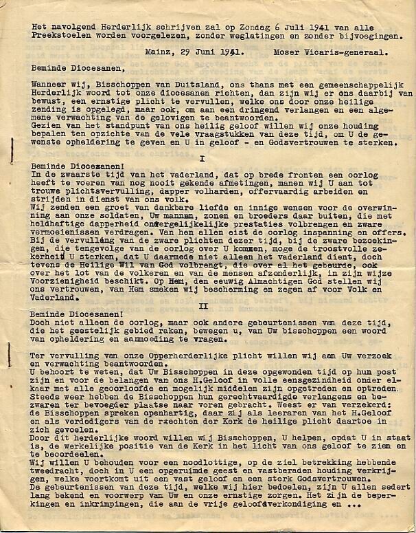 Getypte Nederlandse vertaling van een tekst van Duitse bisschoppen, uitgesproken vanaf de preekstoelen op 6 juli 1941. De preek is een protest tegen beperkingen op het gebied van de godsdienst.