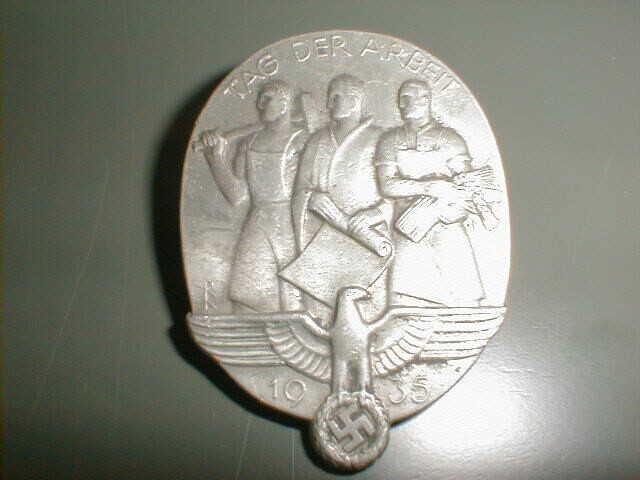 Een reversspeld van aluminium met de afbeelding van drie mannen die verschillende bedrijfstakken symboliseren: een met een hamer voor de industrie, een met een rol papier voor de wetenschap en een met een korenschoof voor de landbouw. Onderaan de Duitse rijksadelaar met gespreide vleugels en het hakenkruis in de klauwen. Tekst op het Insigne: "Tag der Arbeid 1935". Op de achterkant: "C.T.H. Dicke, Lüdenscheid".