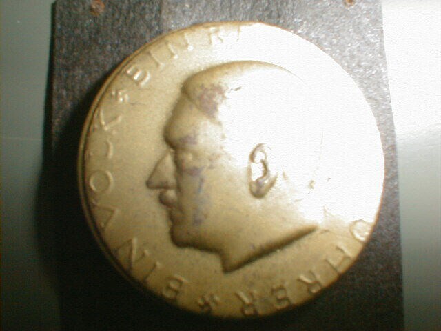 Een rond goudkleurig metalen speldje met in reliëf het portret van Adolf Hitler en profil van links gezien. Rondom: "Ein Volk, ein Reich, ein Führer" en tussen de tekst kleine hakenkruisen. Uitgereikt aan deelnemers van massabijeenkomsten van de N.S.D.A.P.