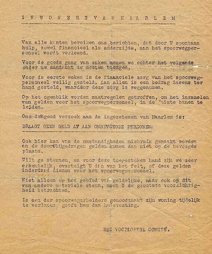 Oproep in de vorm van een stencil tot het verlenen van steun aan het stakende spoorwegpersoneel.