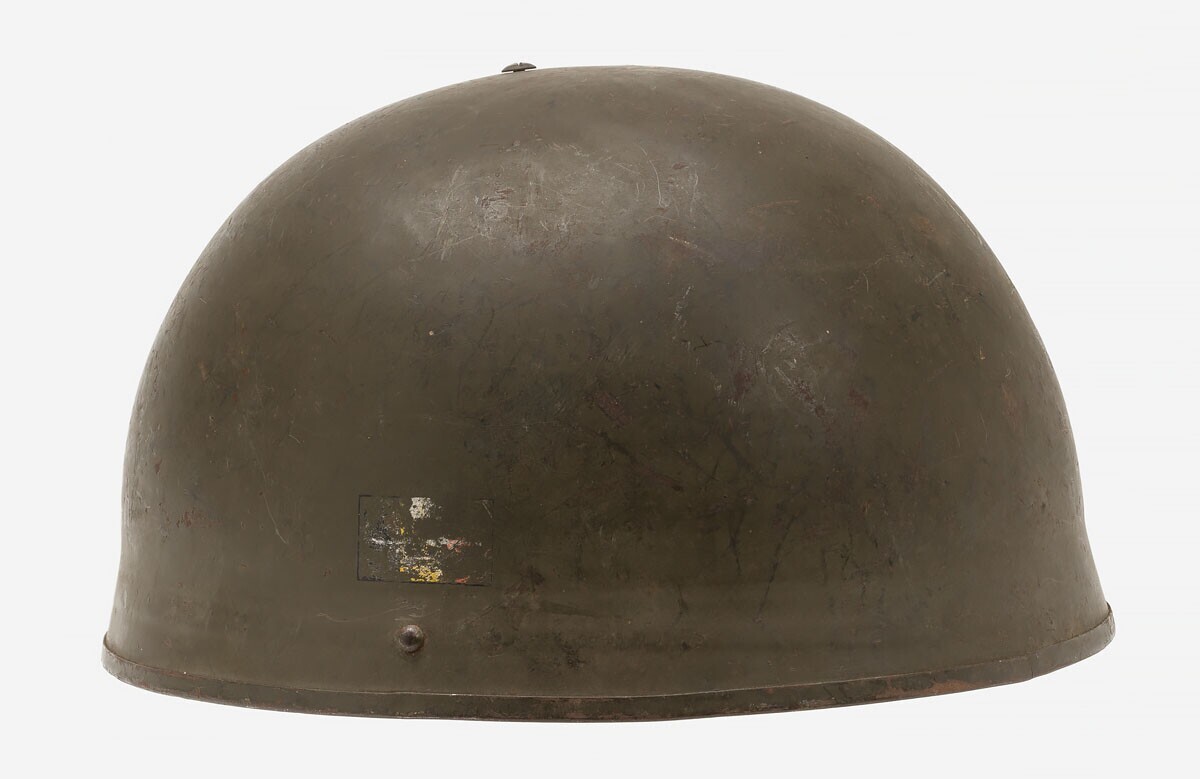 Groene Engelse tankhelm met binnenwerk van leer. De kinband is bevestigd aan gespen. Op binnenwerk: " ABL 1951" wat erop duidt dat de helm in België na de oorlog werd gebruikt.