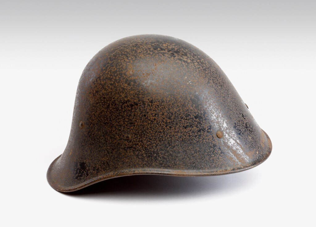 Nederlandse helm M27/M34 vermoedelijk uit 1940 met binnenwerk en kinband van leer. De buitenkant is zwartgelakt. Gezien de zwarte kleur is de helm bestemd voor een Burgerwacht of voor een Marinier.