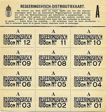 Een complete witte "Regeeringsvisch-distributiekaart A" met het wapen van de stad Amsterdam. De bonnen zijn genummerd van 1 tot en met 12 en kunnen worden afgescheurd langs de geperforeerde randen.
