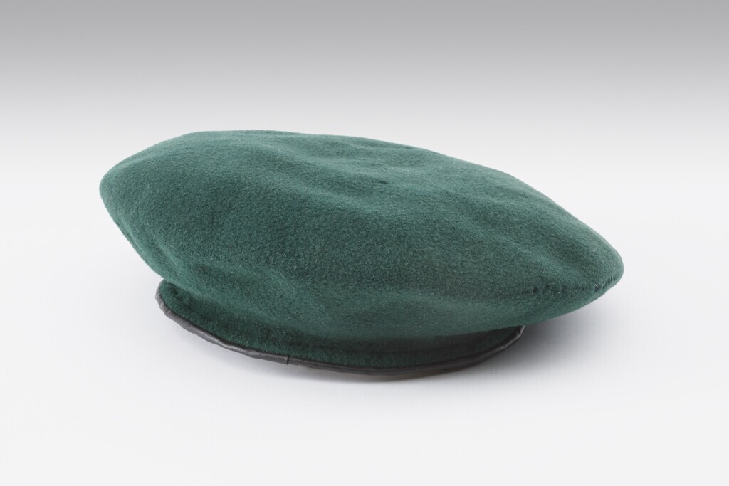 Groene baret van wol gedragen door de Britse commando's tijdens de Tweede Wereldoorlog. De hoofdband bestaat uit een zwarte kunstleren bies. De binnenkant van de baret is niet gevoerd. Op de achterkant een zwart katoenen strikje. Op de binnenkant is een wit stempel aangebracht. De tekst is afgesleten.