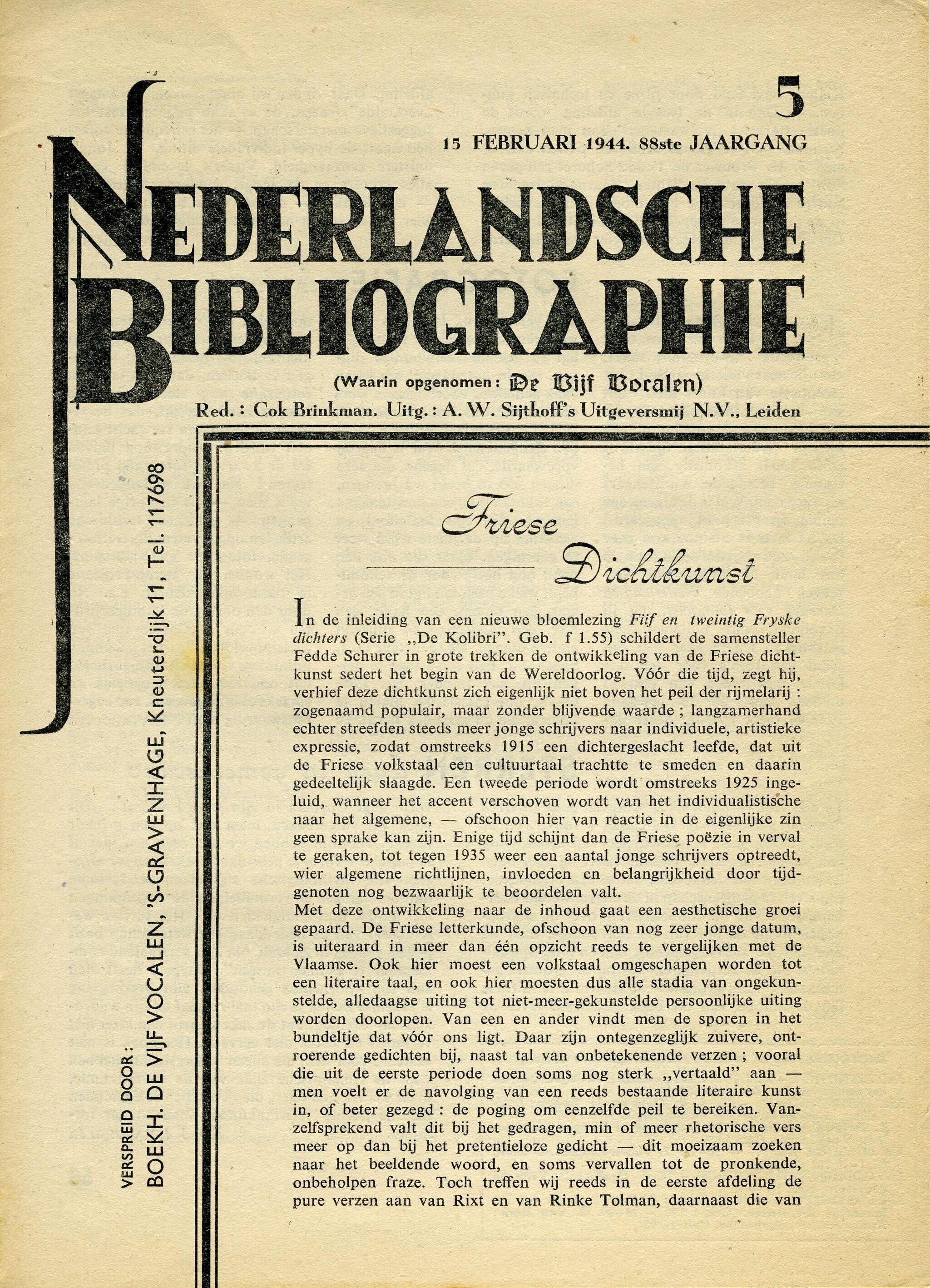 No. 5 en 6 van het tijdschrift ''Nederlandsche Bibliographie". De tekst op de voorpagina is links en boven omkaderd. Bovenaan de naam van het blad in capitalen; de linkerpoot van de "N" loopt naar beneden tot halverwege de pagina. Het tijdschrift bevat boekbesprekingen. De reeks werd verspreid door boekhandel "De Vijf Vocalen'' uit Den Haag.
