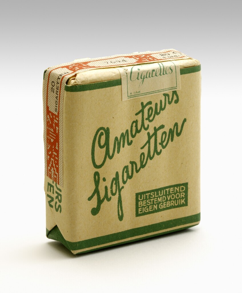 Een crèmekleurig ongeopend pakje Amateurs sigaretten met groene opdruk en een intacte banderol. Rechts onder de merknaam staat: "Uitsluitend bestemd voor eigen gebruik". Op de achterkant in een groen kader een verbod de sigaretten te verhandelen.
