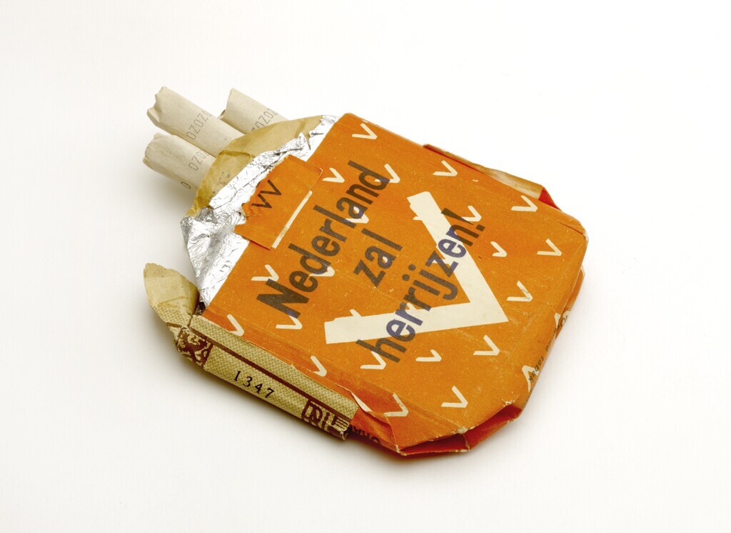 Een pakjes sigaretten met een oranje wikkel dat werd afgeworpen boven Nederland door geallieerde vliegtuigen op of omstreeks Koninginnedag 1941. Op het pakje staan kleine witte V's en in blauw gedrukt: "Nederland zal herrijzen!". Op de achterkant, eveneens in blauw gedrukt, een bekroonde 'W' als symbool voor koningin Wilhelmina met de datum: 31 augustus 1941. Op de zijkanten: "Oranje zal overwinnen!" en "Deze cigaretten zijn vervaardigd uit Nederlandsch Indische tabak". Het pakje is geopend; er resteren nog zeven sigaretten.