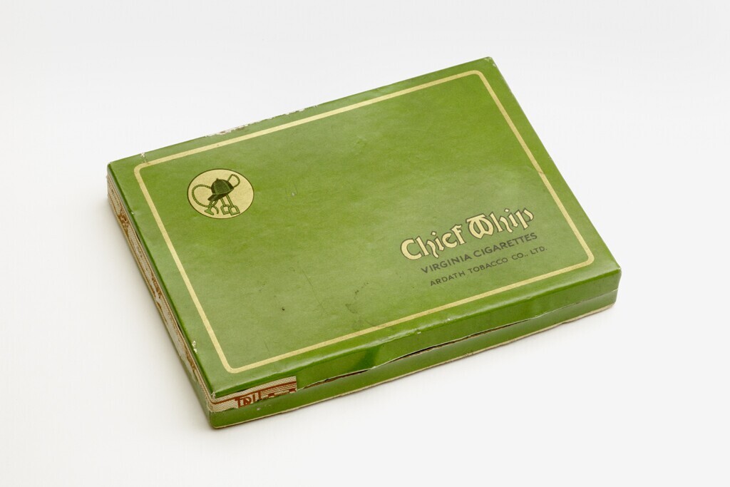 Een groen rechthoekig kartonnen sigarettendoosje. Op het deksel linksboven binnen op een rond gouden veld de afbeelding van drie symbolen van de paardensport: een zweep, stijgbeugels en een helm. Rechtsonder in gouden letters de merknaam 'Chief Whip' en daaronder in zwart: 'Viginia cigarettes, Ardath Tobacco co.. ltd.' Langs de rand van het doosje een gouden kader. In het doosje is de wikkel van zilverpapier aanwezig.