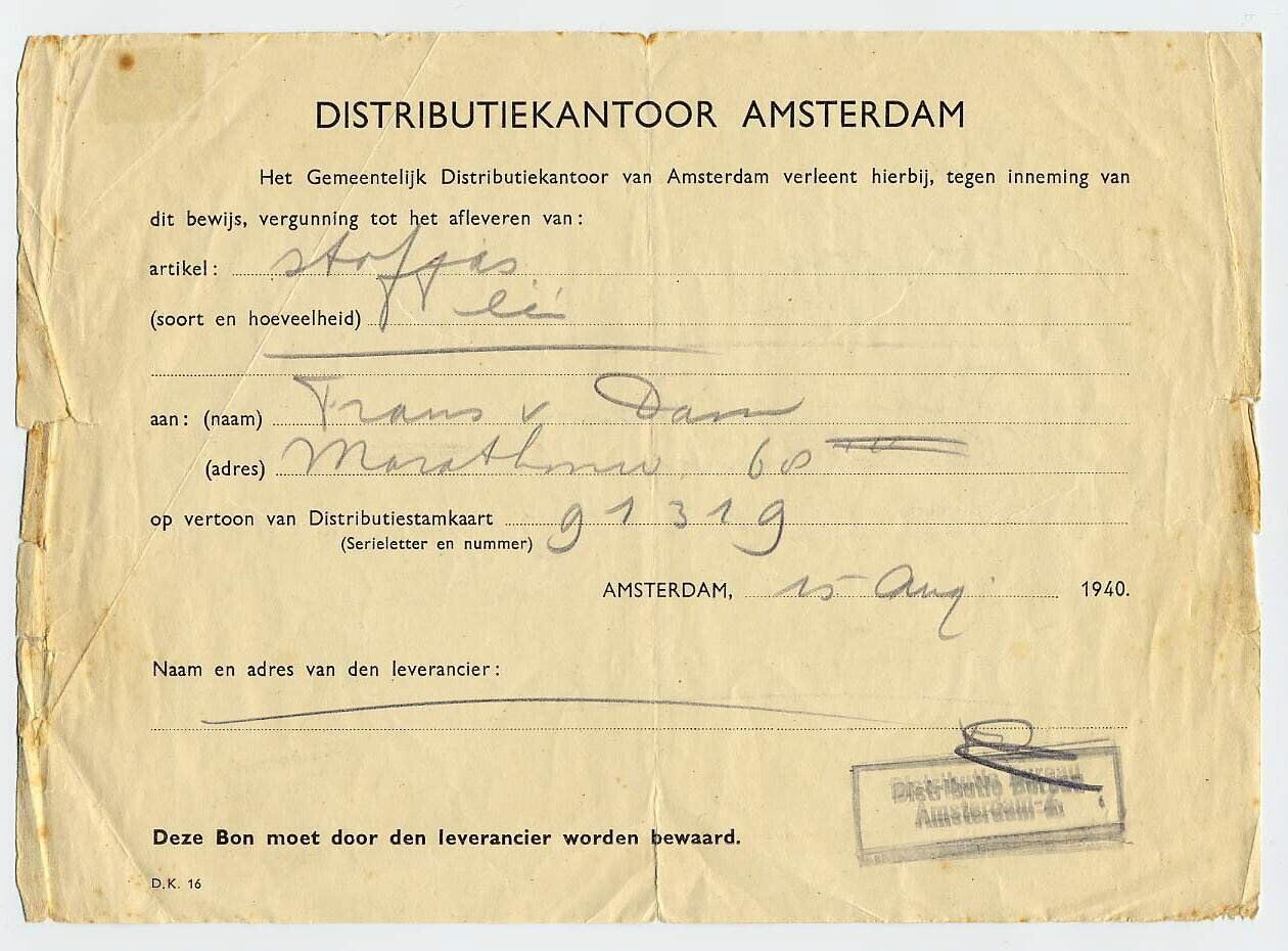 Voorgedrukte witte bon waarmee toestemming wordt verleend tot het leveren van een stofjas op vertoon van de distributiekaart.<br>