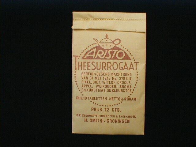 Een lichtgeel papieren zakje Aristo theesurrogaat met bruine opdruk. op xde voorkant de merknaam edrukt. Op de voorkant een gestippelde cirkel met bovenaan een bruin vlak met de merknaam in schuine letters. Daaronder het woord 'theesurrogaat' en de bestanddelen. Op de achterkant een gebruiksaanwijzing.