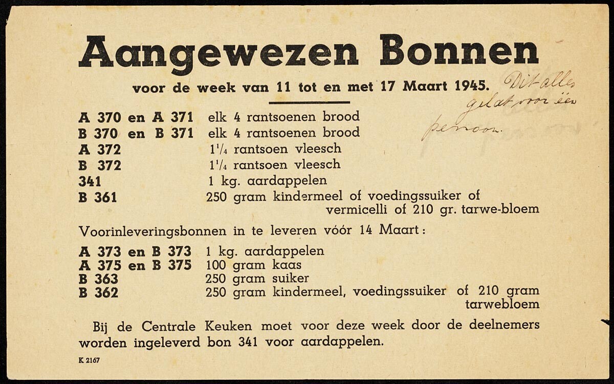 Een bekendmaking over de voedselbonnen voor de week 11 tot en met 17 maart 1945 van de Centrale Keuken.