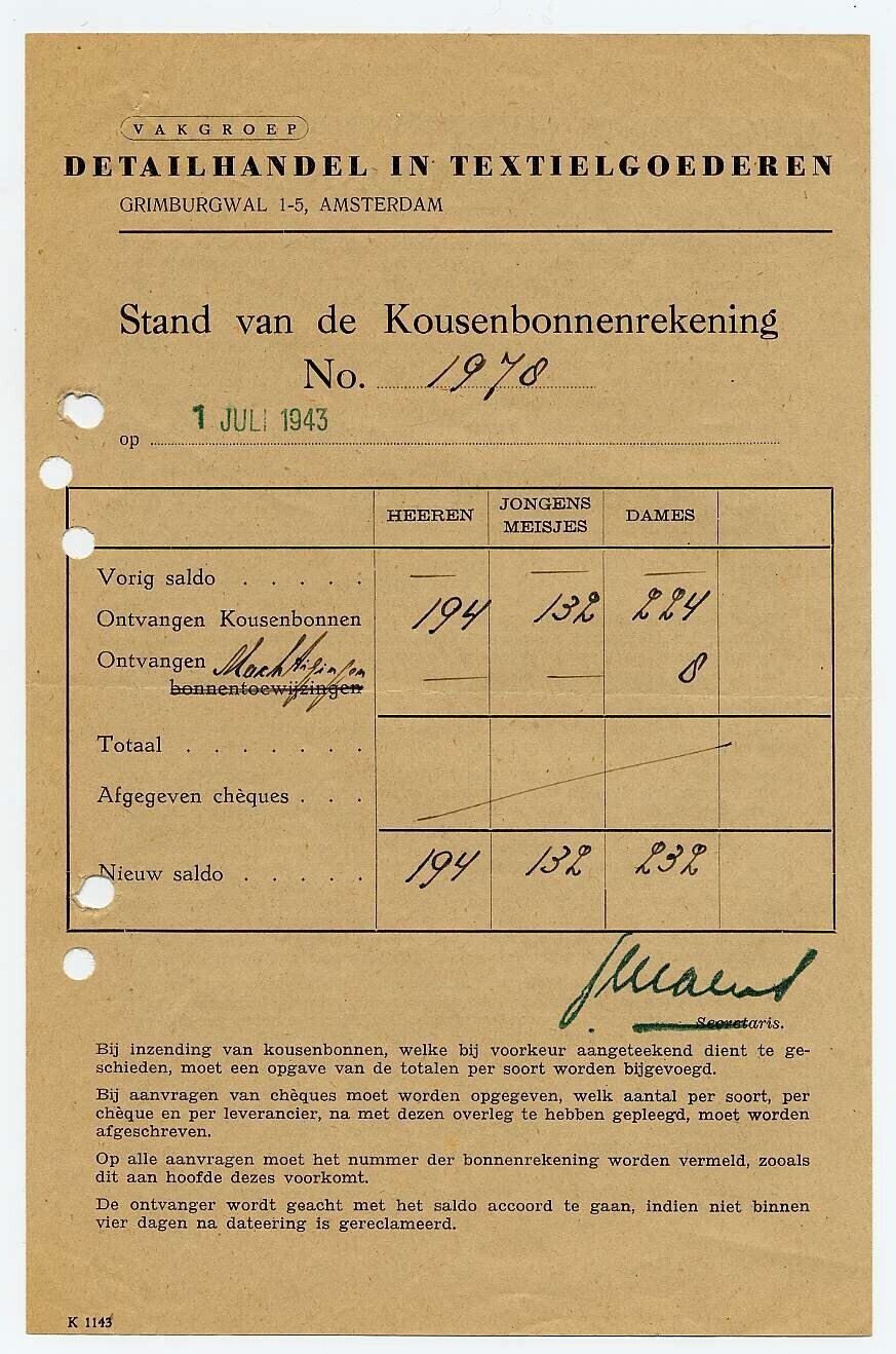 Twee kousenbonnenrekeningen van Detailhandel in Textielgoederen (Detex) te Amsterdam. Rekening No. 1978, 1 juli 1943 met tabel betreffende bonnenoverzicht van heeren-/jongens-/meisjes-/dameskousen met een groen stempel. Op de achterkant staat het reglement "Regeling herbevoorrading op kousenbonnen". Rekening No.1978, 12 augustus 1943 met tabel betreffende het saldo-overzicht van heeren-/jongens-/meisjes-/dameskousen met een zwart stempel, het ontvangen aantal (5) cheques no. 26390 t/m 26394.