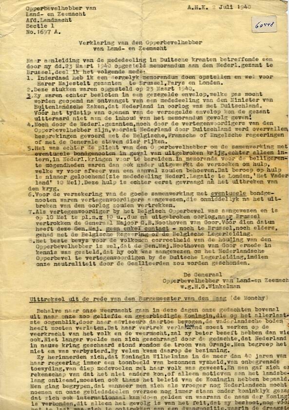 Afschrift van een brief waarin generaal Winkelman reageert op aantijgingen in Duitse kranten dat hij voor het uitbreken van de oorlog contact had gehad over samenwerking met de regeringen van België, Frankrijk en Engeland. Daarnaast bevat het document een uittreksel uit een rede van de Haagse burgemeester De Monchy, uitgesproken vlak na de Nederlandse capitulatie.