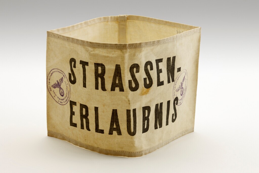 Witte katoenen armband met in zwart de tekst "Strassenerlaubnis" en twee ronde paarse stempels met in het midden de Duitse Rijksadelaar met in zijn klauwen het hakenkruis. Langs de rand: "Der Landstrassenbevollmachtigte beim Wehrmachtbefehlhaber in den Niederlanden".
