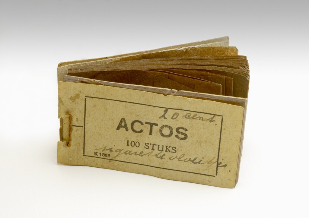 Een pakje 'Actos 100 stuks sigarette vloeitjes 20 cent'.