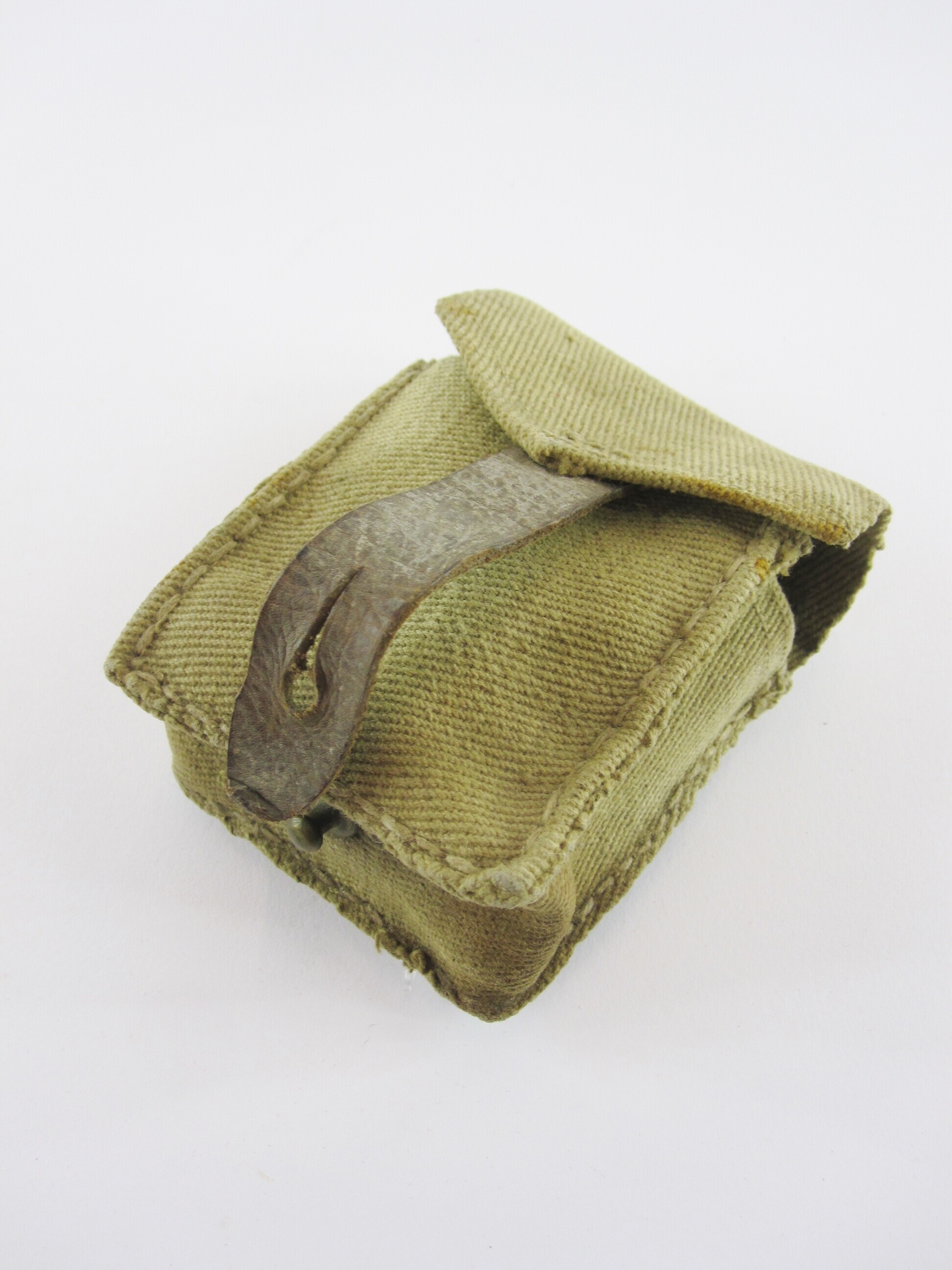 Een canvas patroontas met leren riempje met koperen knop om de klep mee vast te zetten. Aan de achterkant een leren band om aan een broekriem te hangen.