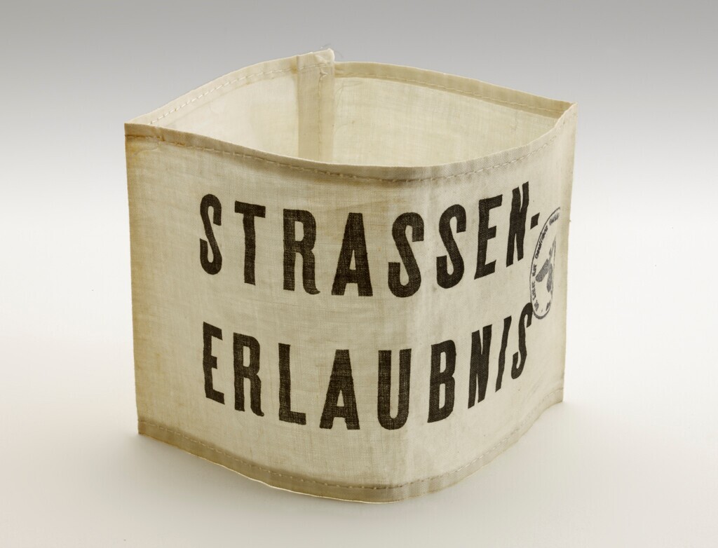 Witte mouwband met daarop in zwarte letters: "Strassenerlaubnis" en een zwarte stempel met Duitse Rijksadelaar en hakenkruis en: "Der Leiter der deutschen (...) Niederlande Den Haag".