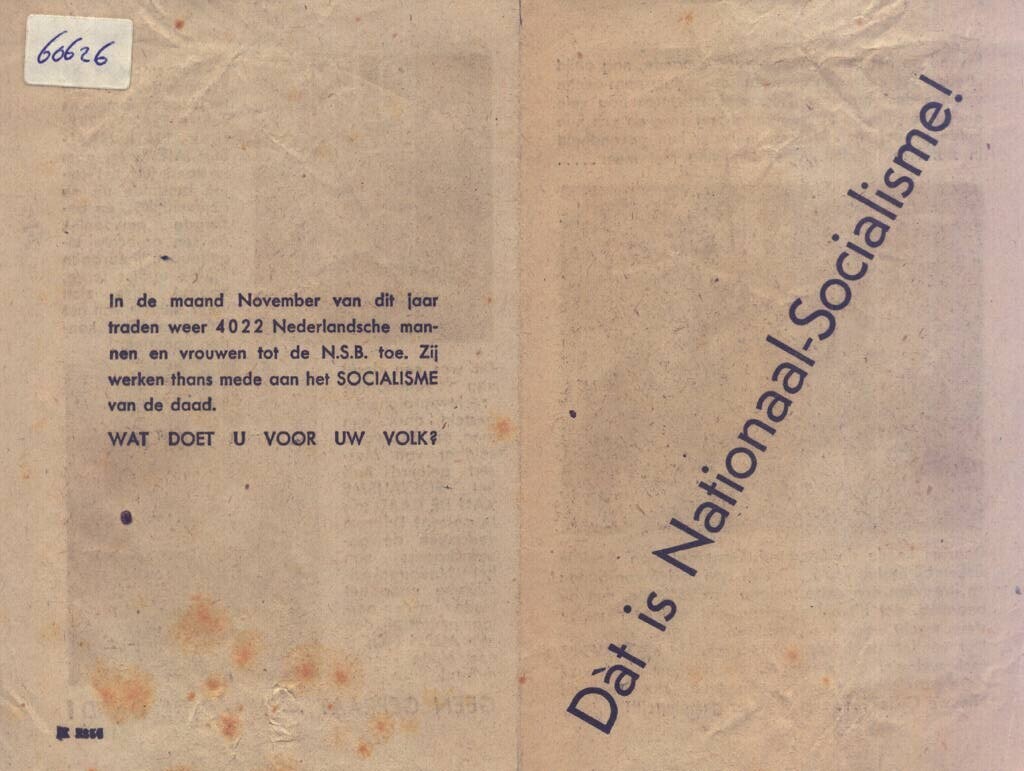 Twee exemplaren van een gedrukte folder met op de voorzijde diagonaal de titel: "Dàt is Nationaal-Socialisme". Aan de binnenzijde een drietal foto's en een tekst over de armoede van de "ouden van dagen". Op de achterkant de mededeling: "In de maand November van dit jaar traden weer 4022 Nederlandsche mannen en vrouwen tot de N.S.B. toe. Zij werken thans mede aan het SOCIALISME van de daad. WAT DOET U VOOR UW VOLK?"
