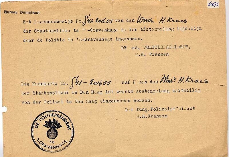 Gestencild en met pen verder ingevuld document, waarin wordt verklaard dat het persoonsbewijs van H. Kroes ter afstempeling tijdelijk door de politie van Den Haag is ingenomen. De tekst is zowel in het Nederlands als Duits gesteld. Linksonder een stempel van "De politieresident 's-Gravenhage".