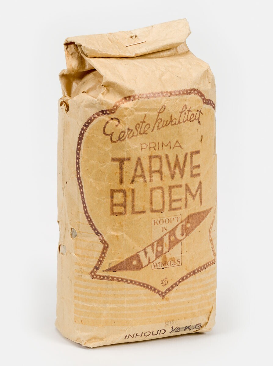 Een papieren zak met tarwebloem. Op de zak staat o.a. gedrukt: "Eerste kwaliteit Prima Tarwebloem. Koopt in W.I.C. winkels".