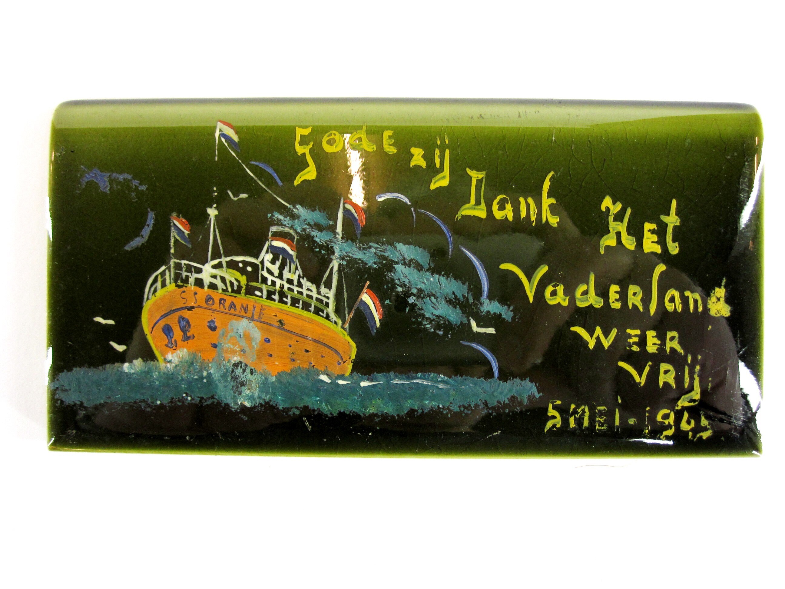 Een groen geglazuurd aardewerken gedenktegeltje vervaardigd van een sierrand uit een betegelde wand. Op het tegeltje is de afbeelding van een oranje schip getooid met verschillende Nederlandse vlaggen. Op het schip staat: "s.s. Oranje". Op het tegeltje staat verder de tekst: "Gode zij Dank Het Vaderland weer vrij 5 mei 1945".