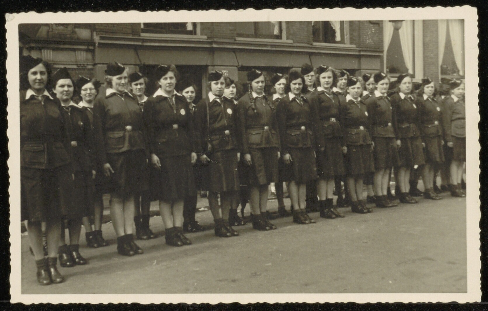 Foto van een groep meisjes in Jeugdstormuniform aangetreden voor het streekkwartier Spaarne. De foto is genomen te Haarlem op 9 april 1944. Aan de achterzijde naast informatie de naam Bea Thorbecke.