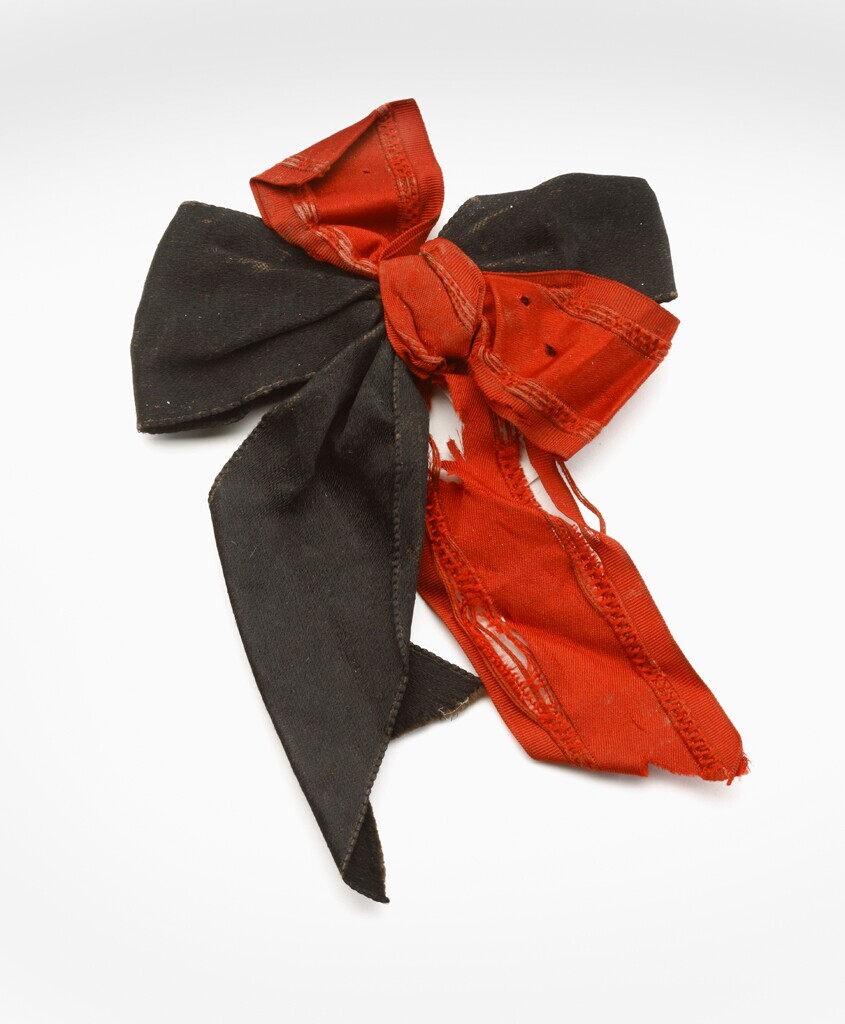 Een strik van rood en zwart zijdeachtig materiaal. De punten zijn V-vormig ingeknipt. Aan de achterzijde is met garen een speldje bevestigd. Gedragen door leden van de N.S.B.