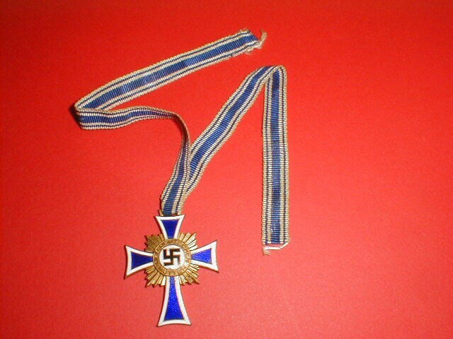 Een medaille: 'Ehrenkreuz der Deutschen Mutter', het Moederkruis bestaand uit een metalen blauwwit geëmailleerd kruis met tussen de armen goudkleurige stralen. In het midden van het kruis op een wit veld een zwart Hakenkruis. Rondom het hakenkruis op een goudkleurige baan de tekst: "Der Deutschen Mutter". De medaille is bevestigd aan een blauwwit gestreept lint. Op 16 december 1938 ingesteld voor moeders die vier of meer kinderen hadden.