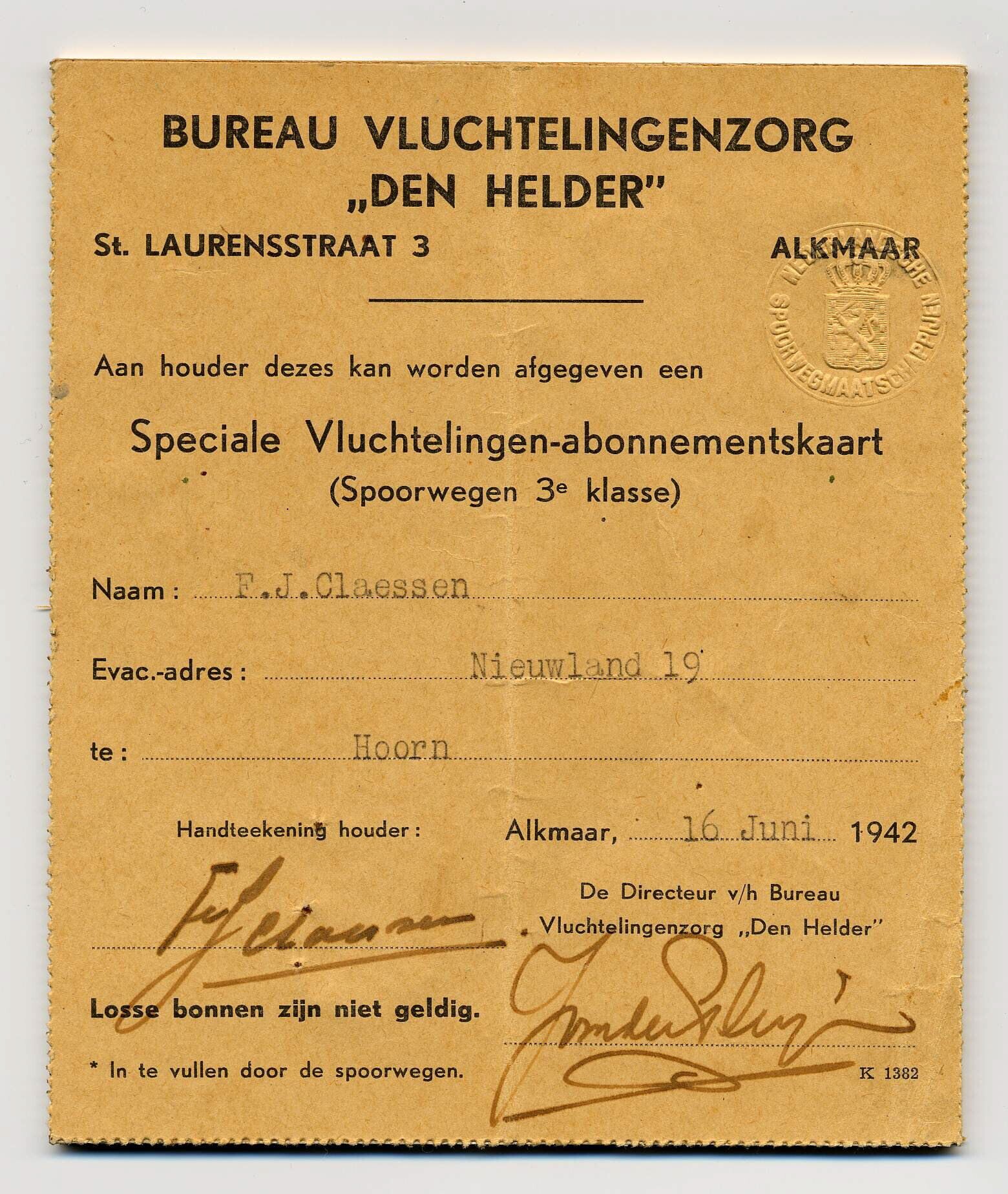 Document, afgegeven door het Bureau Vluchtelingenzorg Den Helder en op naam gesteld van F.J. Claessen te Hoorn met als tekst: "Aan houder dezes kan worden afgegeven een Speciale Vluchtelingen-abonnementskaart (Spoorwegen 3e klasse)".