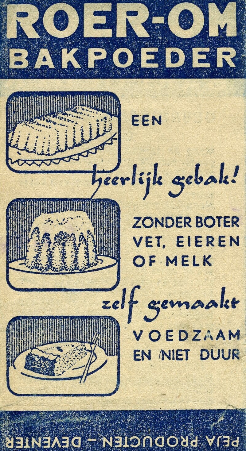 Vouwblad met de gebruiksaanwijzing voor 'Roerom' bakpoeder. Blauw bedrukt met de afbeeldingen van gebak. Aan de achterzijde de toelichting.