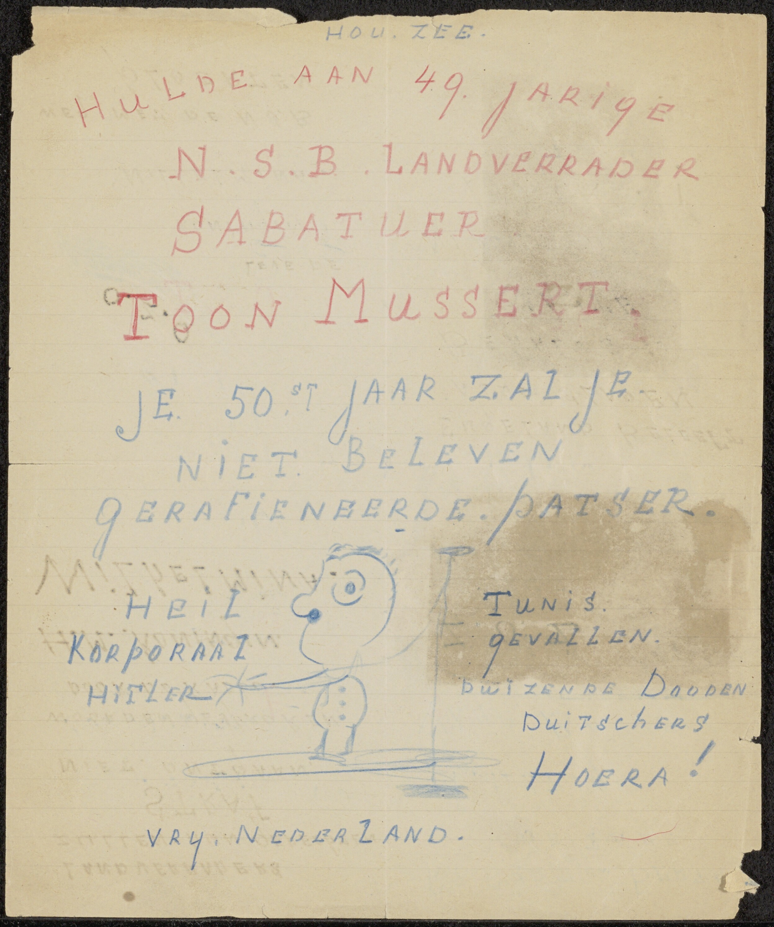 Twee brieven gericht tegen Mussert en de Duitse bezetters: - brief aan beide zijden beschreven. Op een kant met blauw en rood kleurpotlood: "Hou.zee. Hulde aan 49 jarige N.S.B. landverrader sabatuer Toon Mussert. Je 50st jaar zal je niet beleven geraffieneerde patser. Hieronder een tekening die een man met een strop om de nek toont en daarnaast: "Heil korporaal Hitler. Tunis gevallen. Duizende Dooden Duitschers Hoera!" Onderaan: "Vrij Nederland." Op de andere kant staat met zwarte pen aan de linkerzijde: "Landverraders zullen hun gerechten STRAF niet ontgaan, woorden gesproken door de radio. H.M. Koningin Wilhelmina." Hieronder de Nederlandse vlag met daarin "O.Z.O." en daaronder: "leve de Koningin Wilhelmina. Weg met de N.S.B. ploerten". Aan de rechterzijde met blauw potlood: "Robert en Berta de twee lustige vagebonden" bij een uit de krant geknipte foto van Hitler die Mussolini begroet. Hieronder met zwarte pen: "Engeland beleeft alle slagen behalve de laatste. Wie lacht daar!?" - brief aan beide zijden beschreven met blauw en rood kleurpotlood. Op een kant bij een foto uit een krant van Rijksmaarschalk Hermann Goering die zijn gelukwensen aan de jarige Hitler aanbiedt: "54 jaren. De twee ploerten in contact. 't laatste jaar. Heil Hitler 1914-1918. Hieronder: "Burgers, Boeren; en Buitenlui! Heden, Avond Feest Vergadering. Adolf Hitler is 54 jaren. De feestreden worden uitgesproken door de bekende landverraaders Seijs Inqwart, Toon Mussart, Geelkerken, Smibd en verschillende andere Veenhuis boefen. Zegt het voor." Op de andere kant aan de linkerzijde bovenaan een afbeelding van een man met een strop rond de hals met: "De afrekening komt wel ploert. Veenhuis geboefte. Vrij Nederland.' Aan de rechterzijde bovenaan: "Waar je ook schuil gaat. Wij zullen je wel vinden. Nu niet geholpen door een Duitsche vrouw." De tekst op de onderste helft staat omgekeerd geschreven. Links: "Wie de kerkklokken steelt verliest de oorlog". Rechts: "Jij wordt ter dood veroordeeld door 't Nederlandsche Volk. Jij en de andere landverraders. Korporaal Mussert voorop".