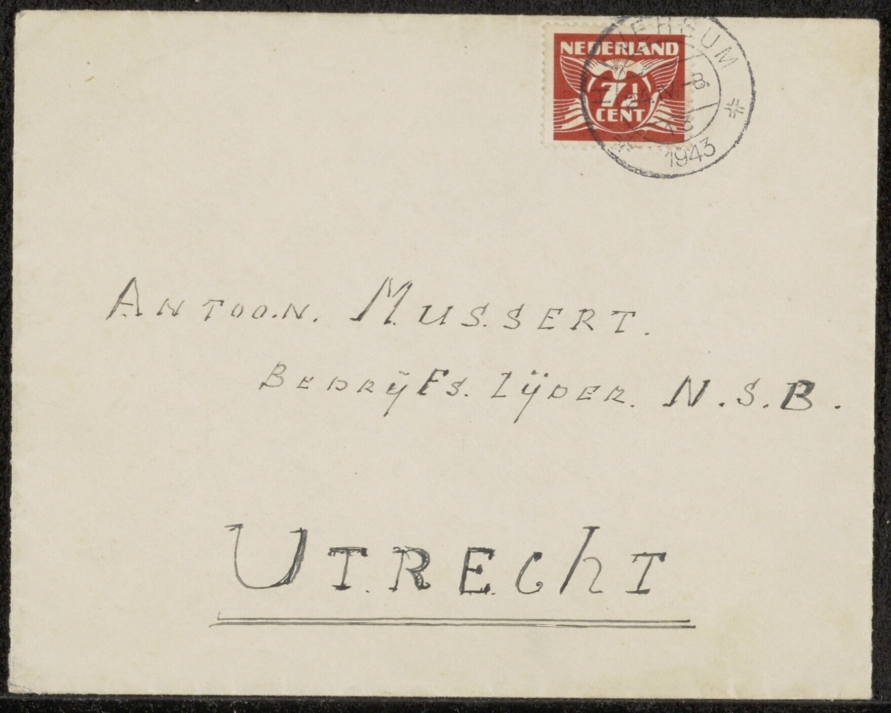 Lege enveloppe waarop staat geschreven 'Antoon Mussert bedrijfslijder N.S.B. Utrecht Afz: Mac: Blokzijl Wassenaar.' Op de achterzijde is de Nederlandse vlag getekend met daarin 'O.Z.O'.