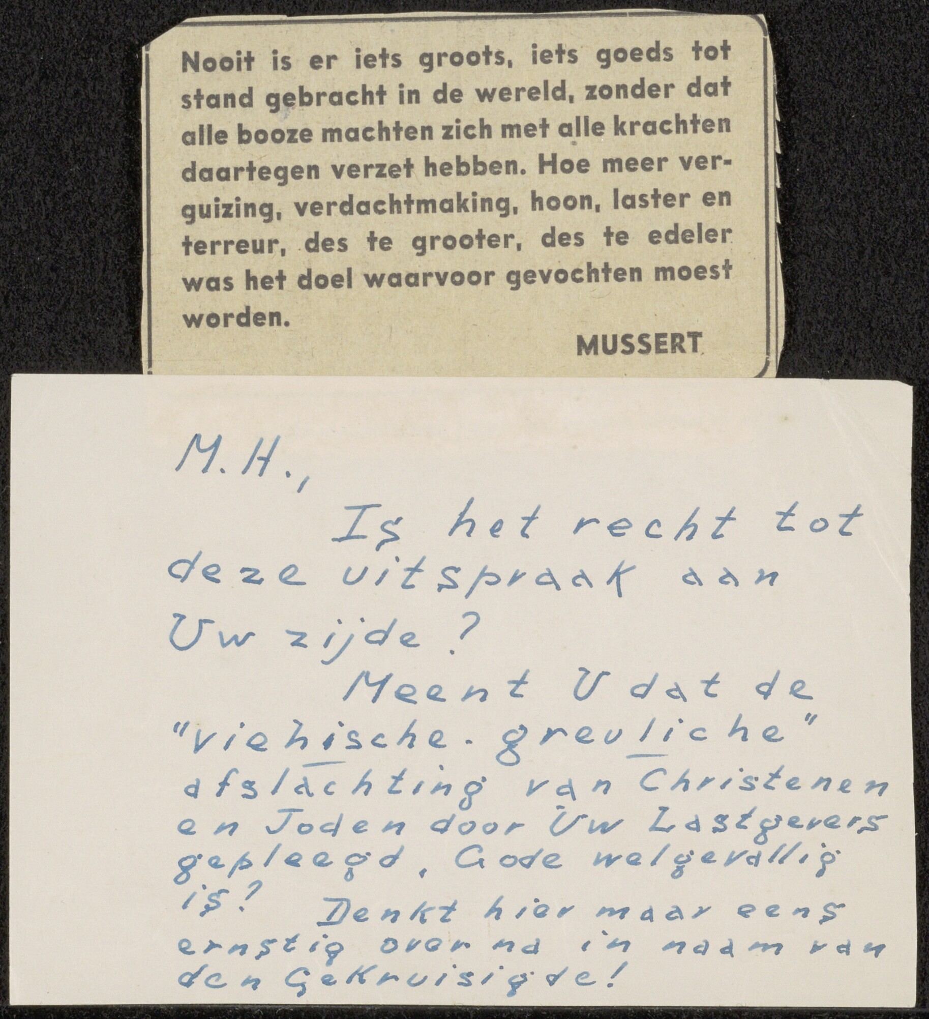 Brief met aan de bovenzijde een krantenknipsel met een citaat van Mussert. "Nooit is er iets groots, iets goeds tot stand gebracht in de wereld, zonder dat alle booze machten zich met alle krachten daartegen verzet hebben. Hoe maar verguizing, verdachtmaking, hoon, laster en terreur, des te grooter, des te edeler was het doel waarvoor gevochten moest worden.'' Daaronder een handgeschreven tekst: 'M.H., Is het recht tot deze uitspraak aan Uw zijde? Meent U dat de "viehische greuliche" afslachting van christenen en Joden door Uw lastgevers gepleegd, Gode welgevallig is? Denkt hier maar eens ernstig over na in naam van den gekruisigde!''