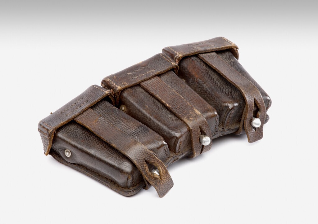 Een bruin leren patroontas bestaande uit drie houders. De houders zijn ieder afzonderlijk af te sluiten met een leren deksel. Aan het deksel een riempje, dat aan de onderkant van de houder met een oog bevestigd kan worden aan een metalen pin met ronde knop. Aan de achterkant twee riemen en een beugel voor bevestiging aan een riem om het middel.