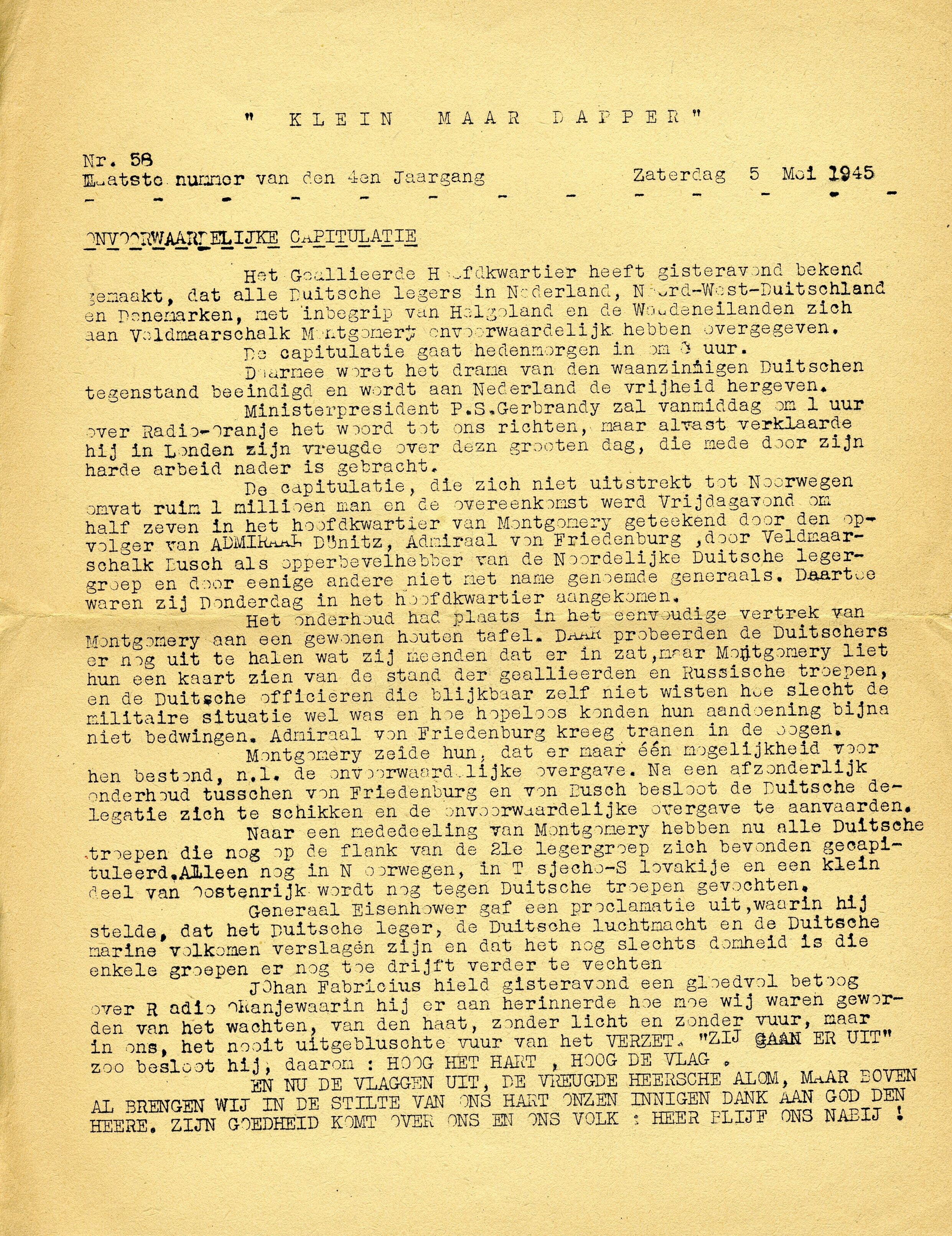Illegale gestencilde uitgave van het ''Klein Maar Dapper'', van zaterdag 5 mei 1945. Het betreft nummer 58, de laatste editie, over de onvoorwaardelijke capitulatie van Duitsland.