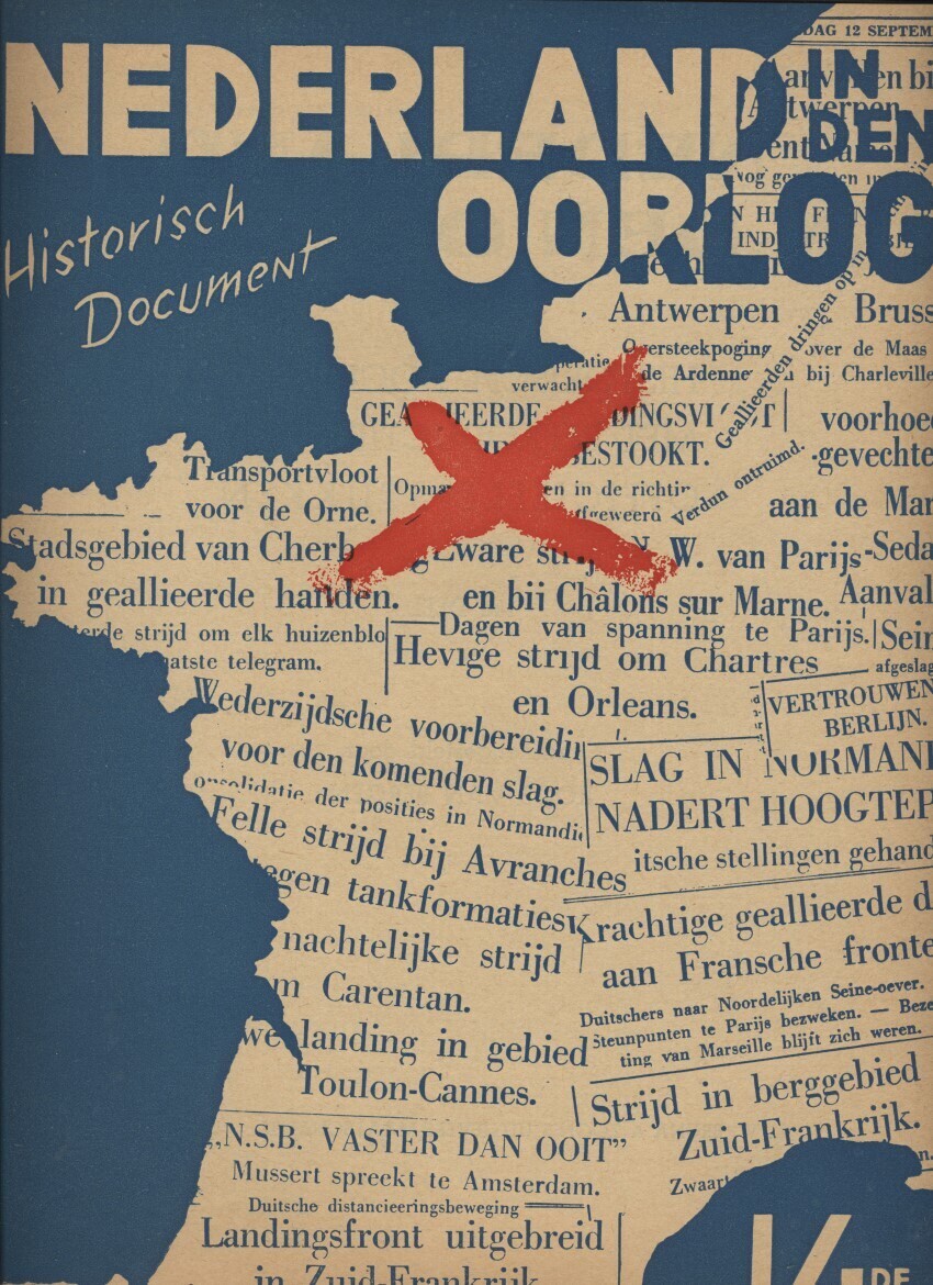 Twee exemplaren van het veertiende deel van de uitgave "Nederland in den Oorlog! Historisch document met reproducties van officieele stukken". Het geeft een overzicht van de oorlog aan de hand van artikelen uit de Nederlandse kranten en kopieën van originele documenten van april tot en met augustus 1944.