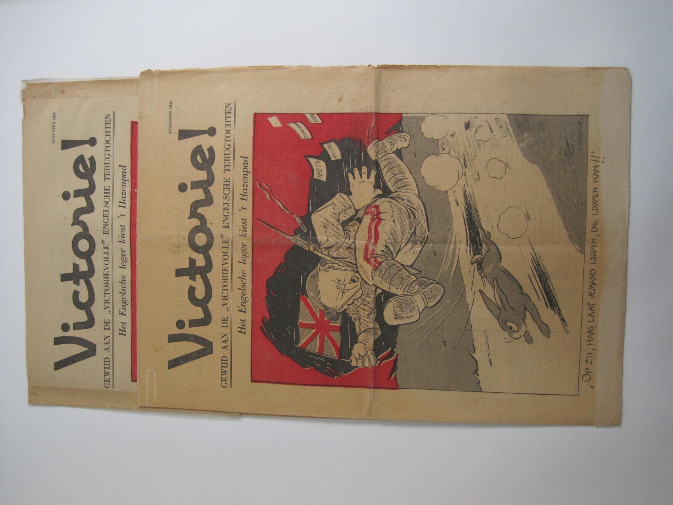 Drie exemplaren van een krant met de titel "Victorie!, gewijd aan de "victorievolle" Engelsche terugtocht". Een uitgave van nationaal-socialistische signatuur.