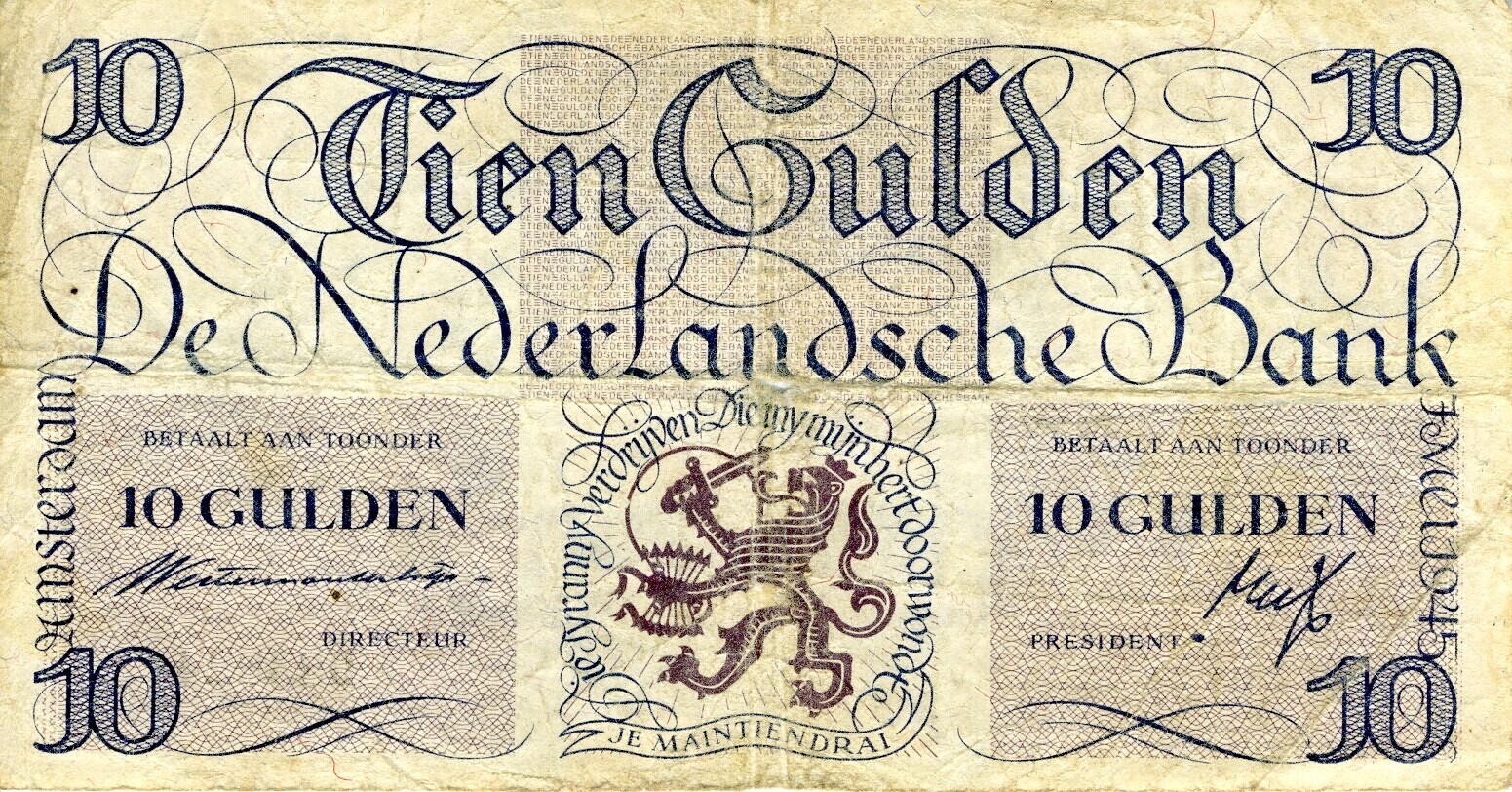 Een bankbiljet van tien gulden met blauwe opdruk over lila raster. Op de voorkant de tekst: "Tien Gulden. de Nederlandsche Bank betaalt aan toonder 10 gulden Amsterdam 7 mei 1945" met de handtekeningen van de directeur en de president. Midden onder de afbeelding van een klimmende Nederlandse Leeuw met daaromheen de tekst: "Die Tyranny verdrijven. Die my mijn hert doorwond. Je Mientiendrai". Op de achterkant een opdruk in blauw en paars met een wetstekst en het serienummer: "2BS 083824". Na de oorlog stevende Nederland af op een monetair faillissement. De Duitse bezetter deed zijn betalingen door de geldpersen overvloedig te laten draaien en de zwarte markt tierde welig. Inflatie dreigt. Onder leiding van de minister van financiën Lieftinck vindt vanaf 6 juli 1945 een grote geldzuivering plaats. Alle biljetten worden ongeldig verklaard en moeten ingeleverd worden bij de bank waar ze op een geblokkeerde rekening werden gezet. De bezitter moet aantonen dat het geld eerlijk was verdiend. De lonen worden in de week van 26 september tot 2 oktober niet uitbetaald en iedere Nederlander kon 10 gulden voor de eerste betalingen opvragen bij de bank in ruil voor tien gulden oud geld. Dit was niet één heel bankbiljet maar vijf biljetten van een gulden en twee van een rijksdaalder. Vanaf 3 oktober 1945 werd het geblokkeerde geld geleidelijk vrijgegeven. Het bankbiljet van 10 gulden van 7 mei 1945 werd het 'Lieftinck Tientje' genoemd naar de naam van de minister.