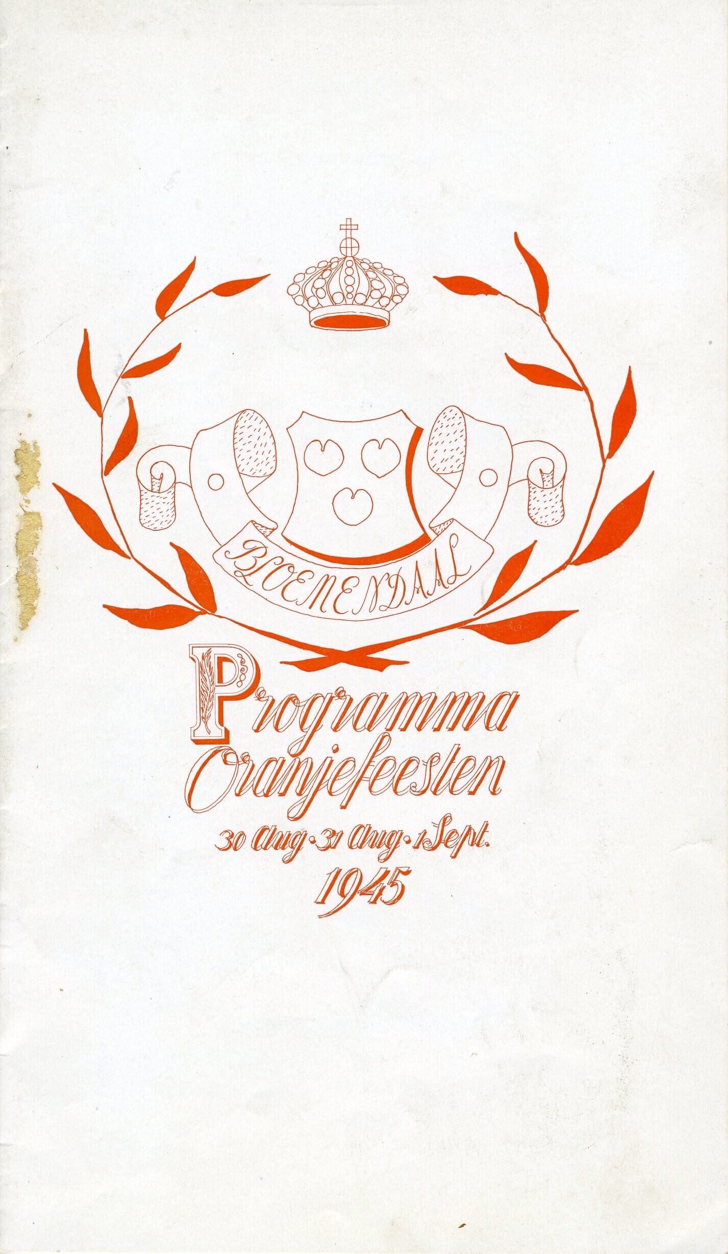 Brochure met daarin het programma van de Oranjefeesten en herdenkingen in Aerdenhout, Bloemendaal-Overveen en Vogelenzang. De omslag is in oranje bedrukt met het gemeentewapen van Bloemendaal en de tekst: "Programma Oranjefeesten 30 Aug - 31 Aug - 1 Sept 1945.''
