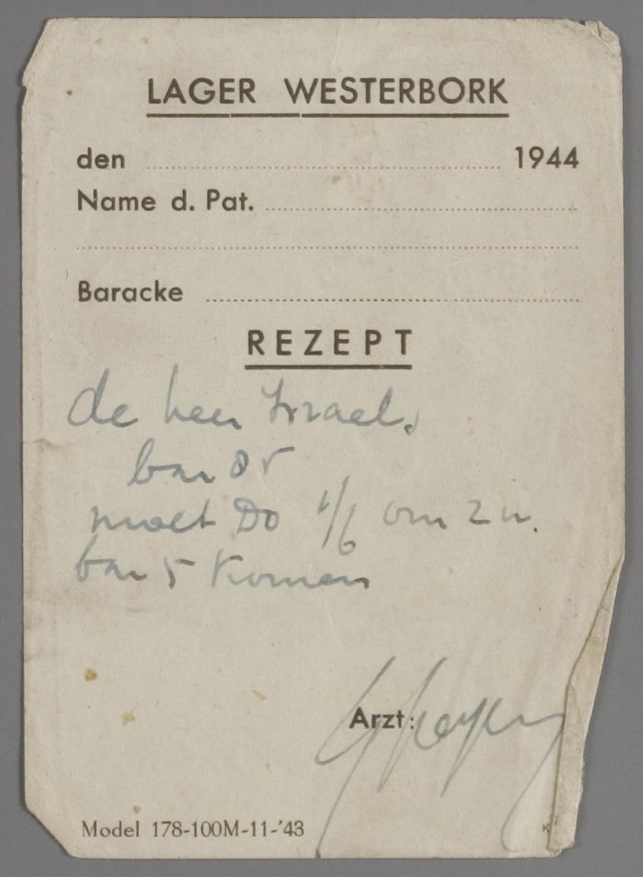Mededeling voor Sander Israels, geschreven op een receptbriefje uit Westerbork, mei 1944