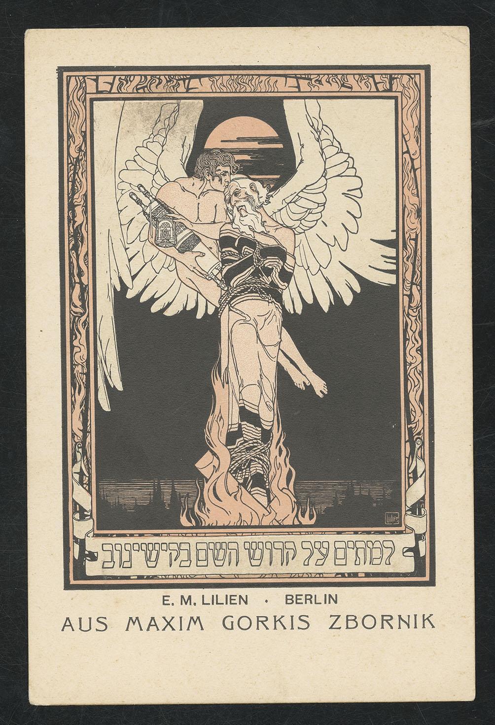 Prentbriefkaart in art nouveaustijl ontworpen door E.M. Lilien met vastgebonden man met in het Hebreeuws de tekst "Voor de doden van de pogrom in Kishinev", 1903